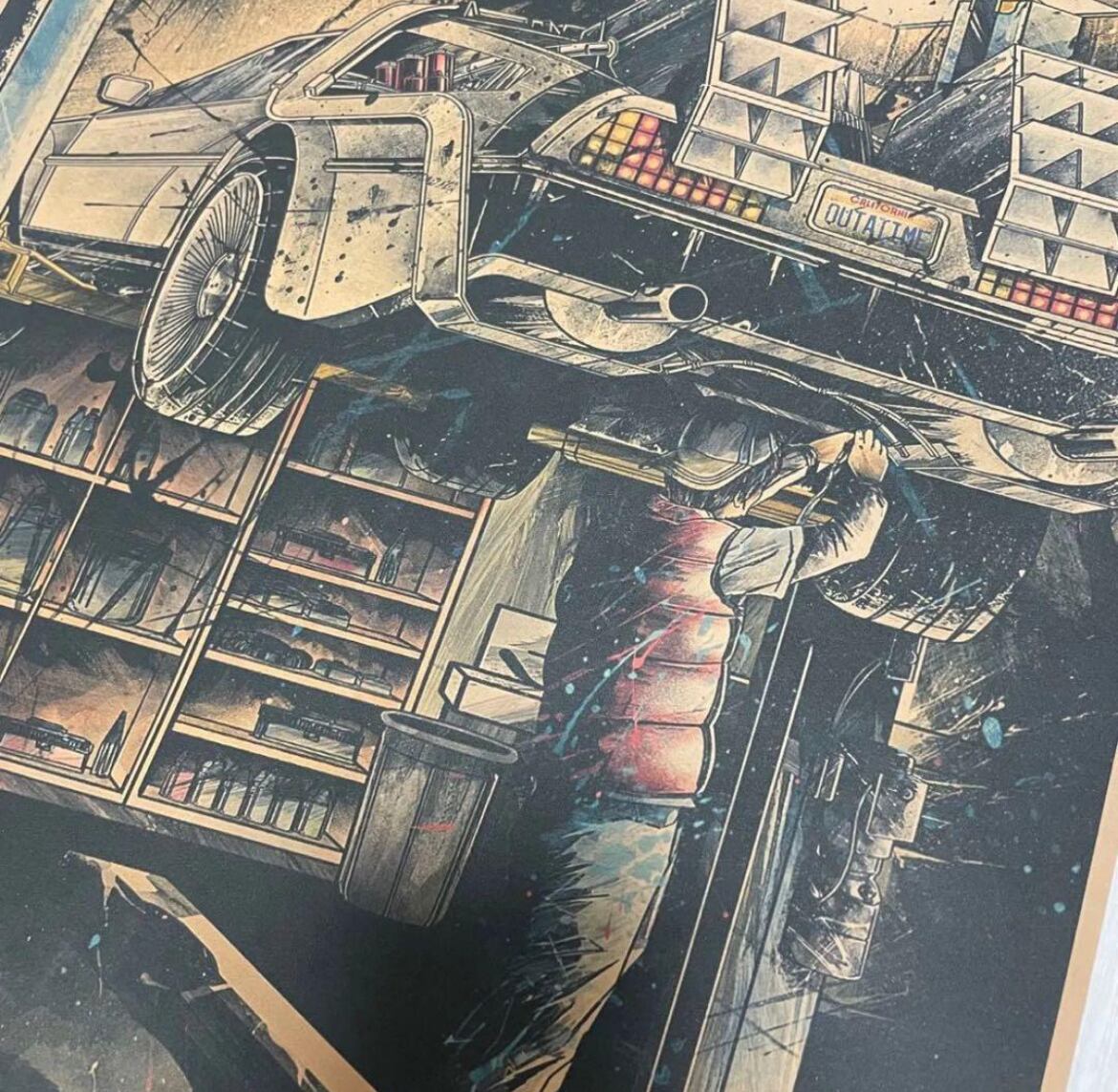 マイケル・J・フォックス主演、映画『バック・トゥ・ザ・フューチャー』のデロリアンを整備するマーティンのお洒落なクラフトポスターです。