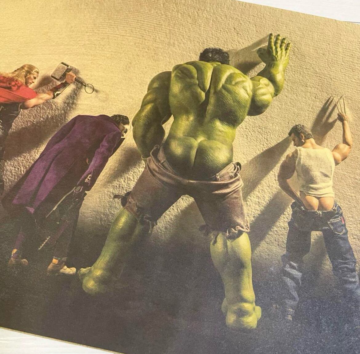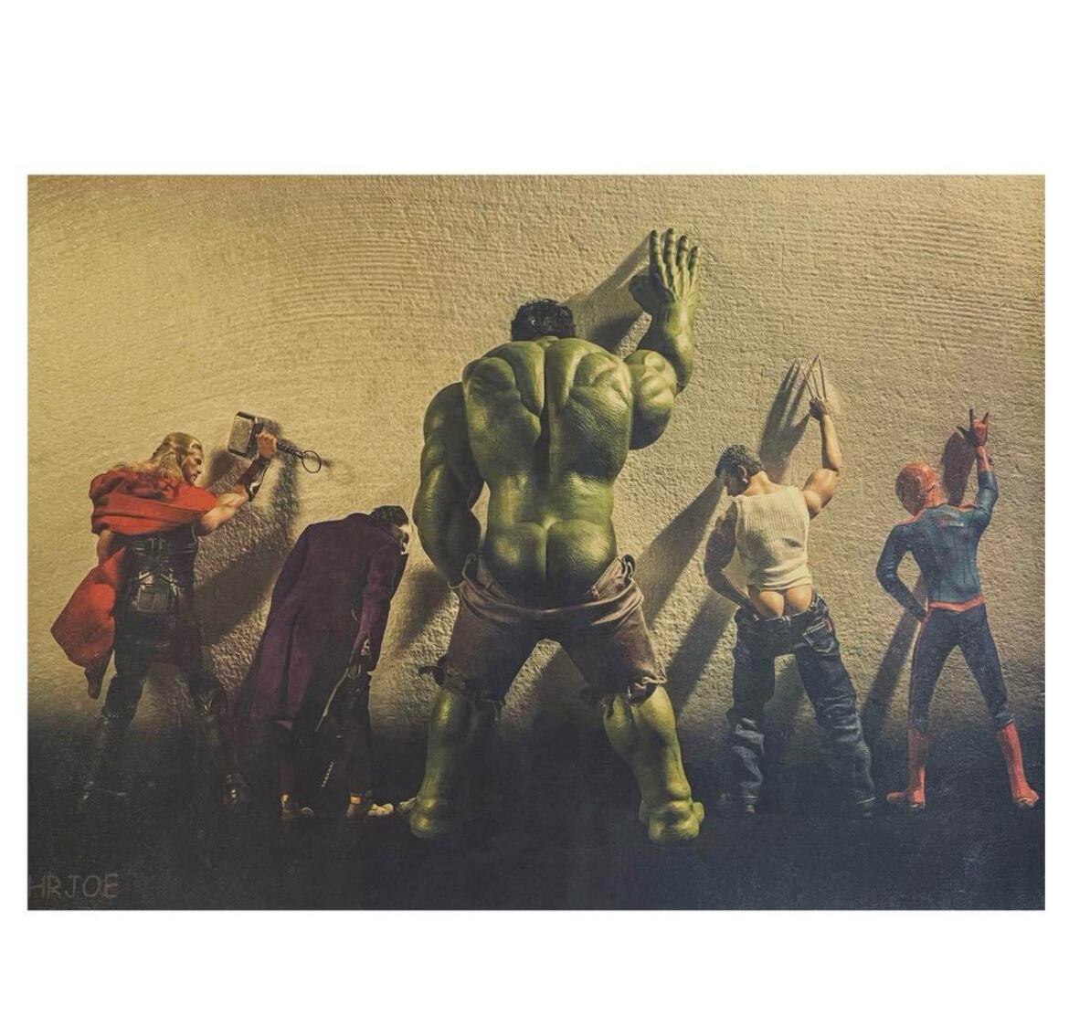 アベンジャーズのハルク、スパイダーマン、マイティーソー、ウルヴァリン、ジョーカーのユニークなパロディーポスターです。
