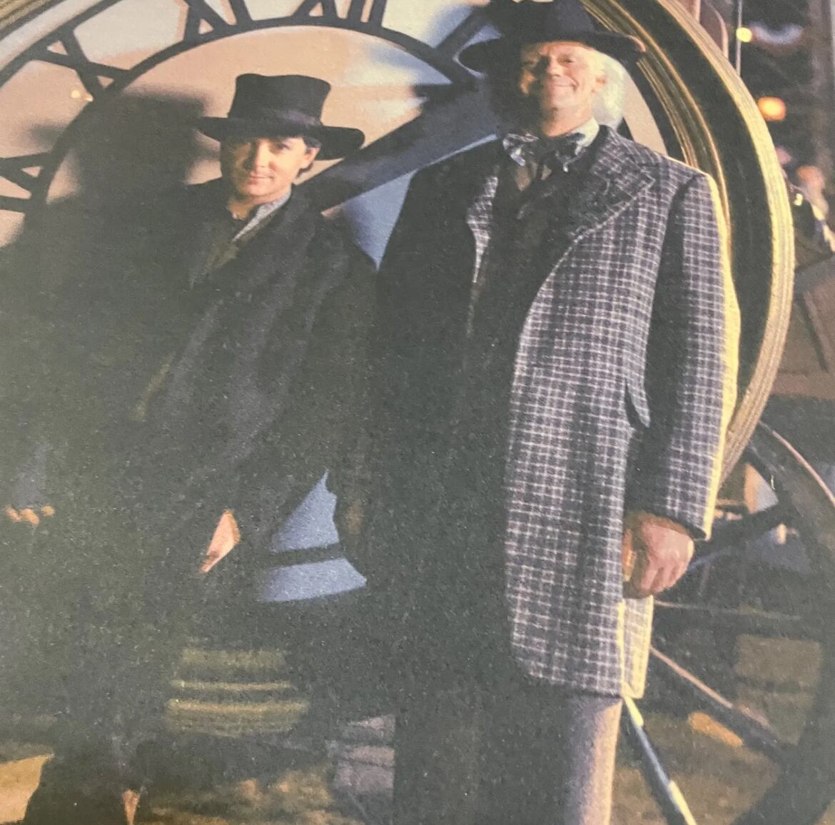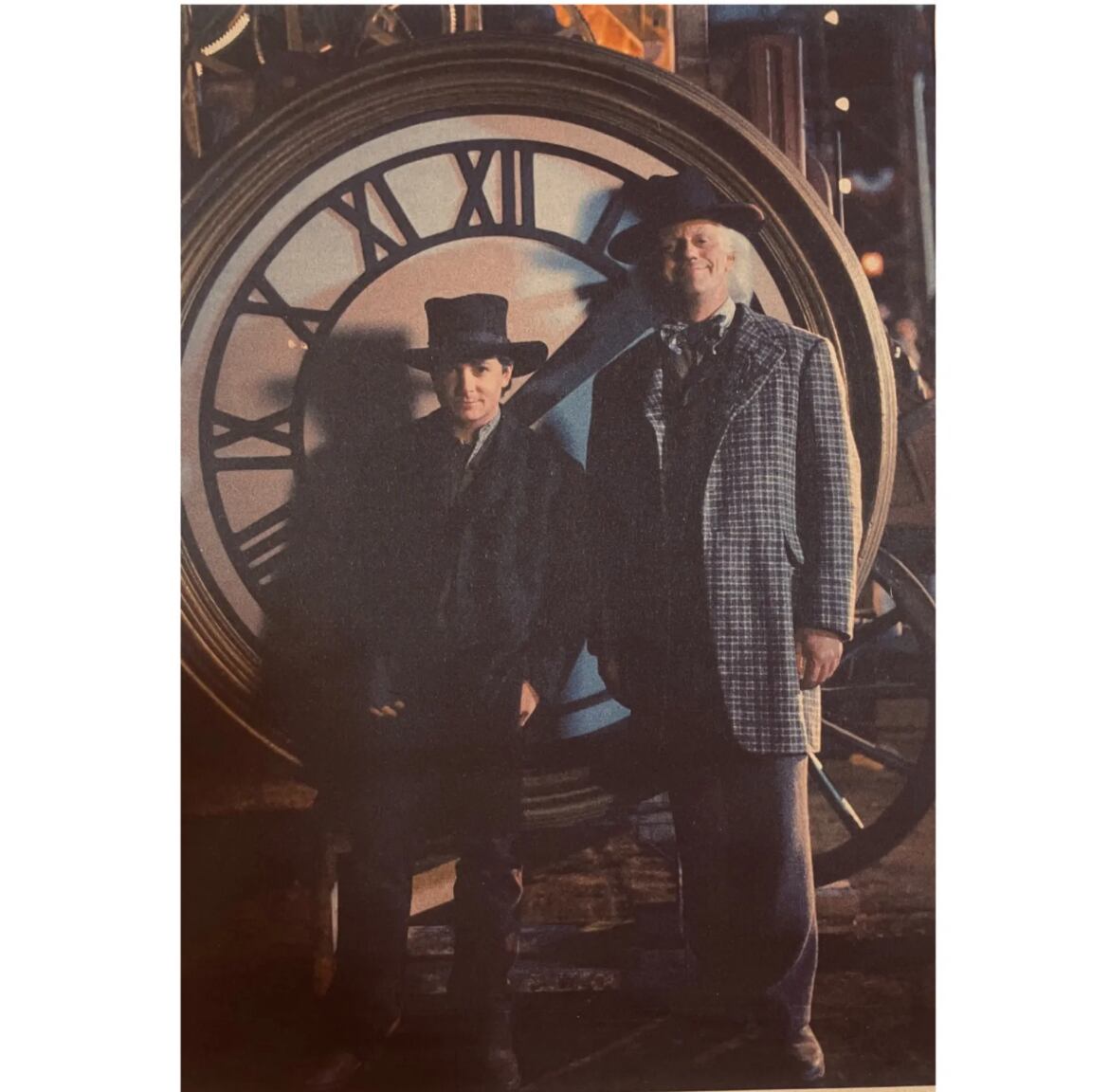 マイケル・J・フォックス主演、映画『バック・トゥ・ザ・フューチャー3』時計台での記念写真のレトロなクラフトポスターです。