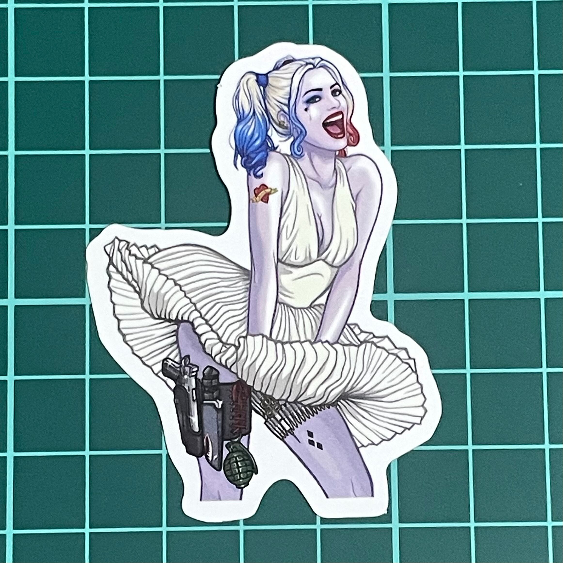 映画バットマンの悪役『ジョーカー』の恋人として人気の出たハーレークインをデザインした洋画好きな方にオススメのステッカーです。