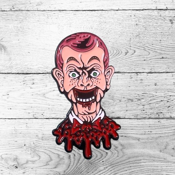 血を流した人形をデザインした不気味なピンバッジです。