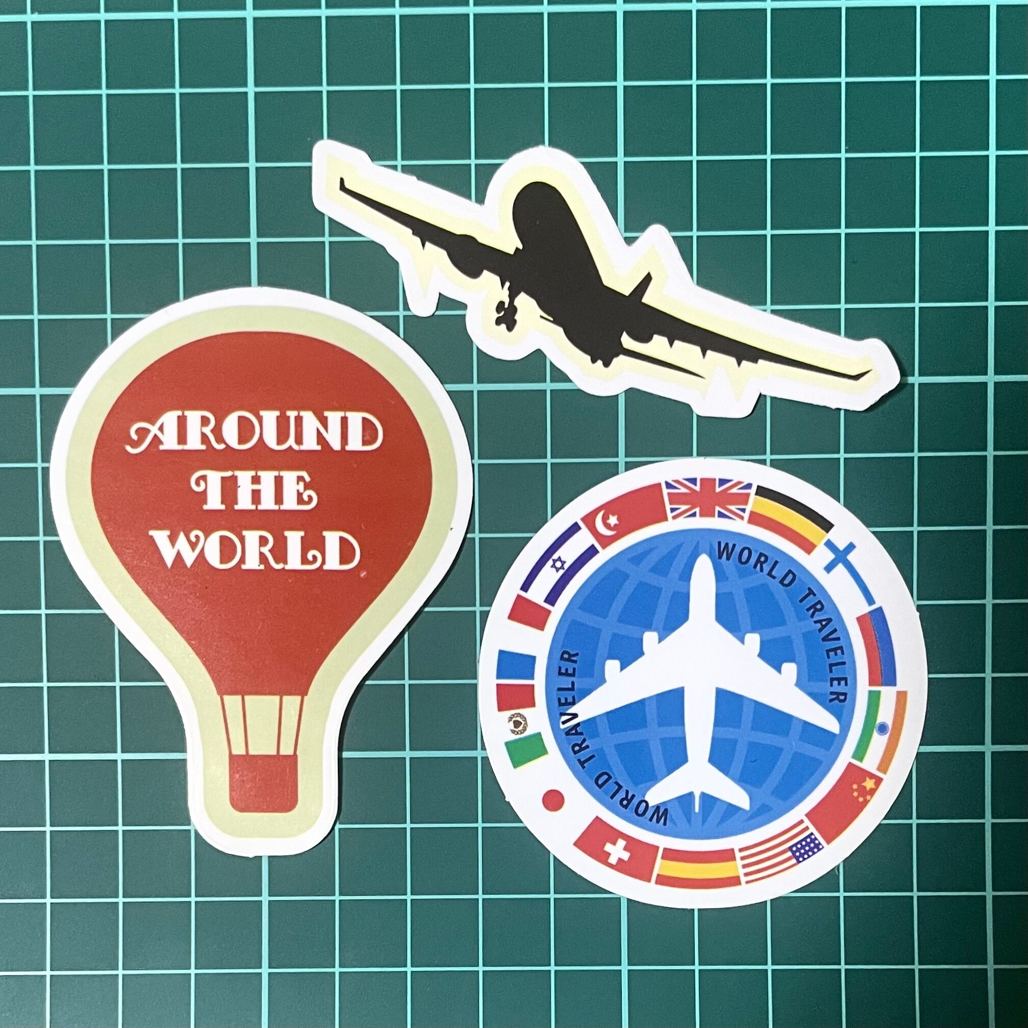 飛行機や気球など海外旅行をデザインした防水ステッカーの3枚セットです。
