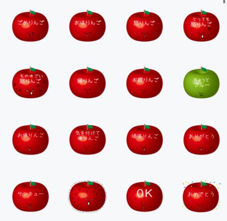 林檎好きの方におススメのリンゴスタンプ。飛び出して動きそうな立体のアップル。青森や津軽の人にも毎日使ってほしい。日常使える基本挨拶40個です。可愛い食べ物キャラ