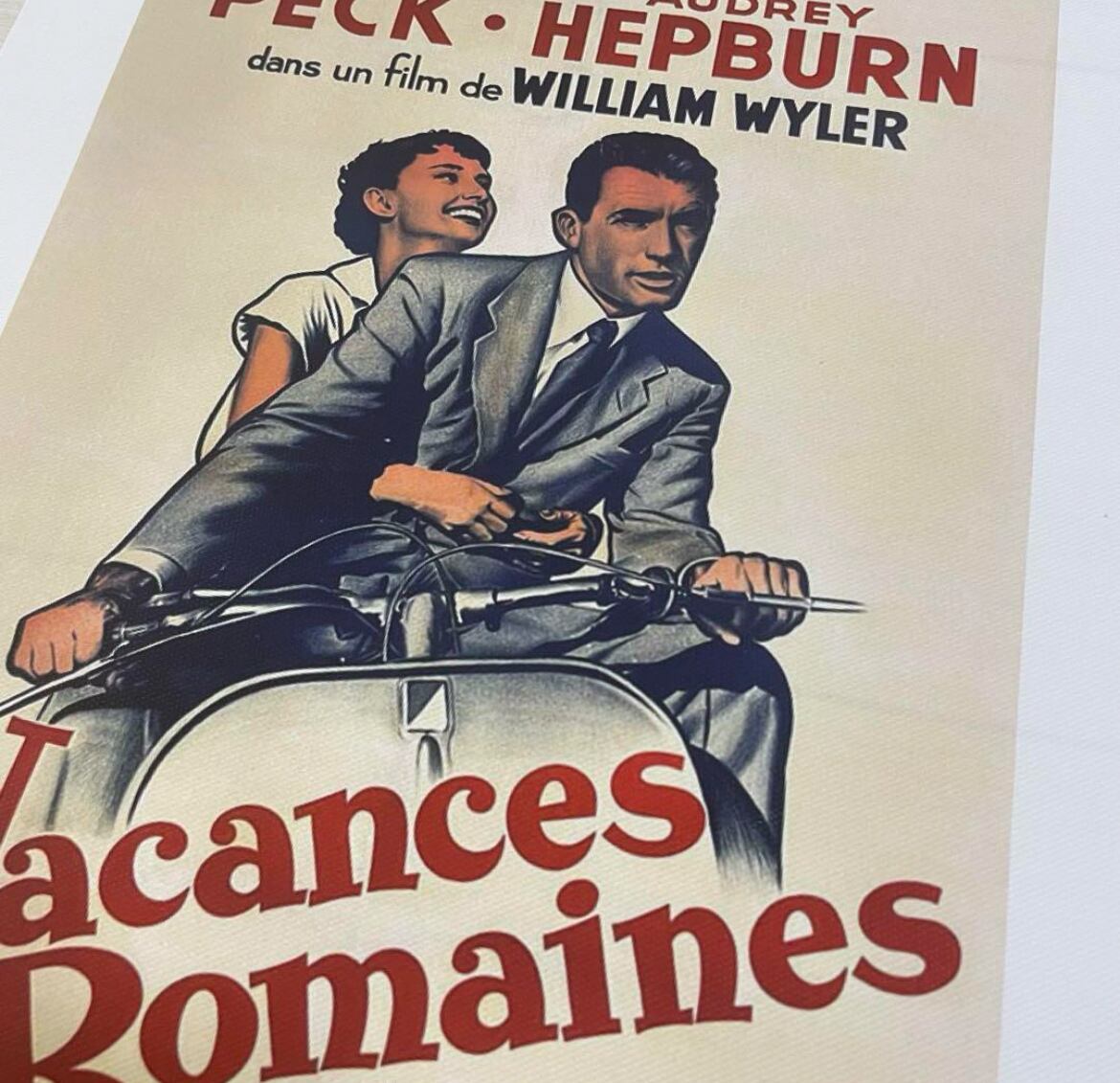 オードリー・ヘプバーンの代表作『ローマの休日』をシルエットでデザインしたレトロなインテリアポスターです。