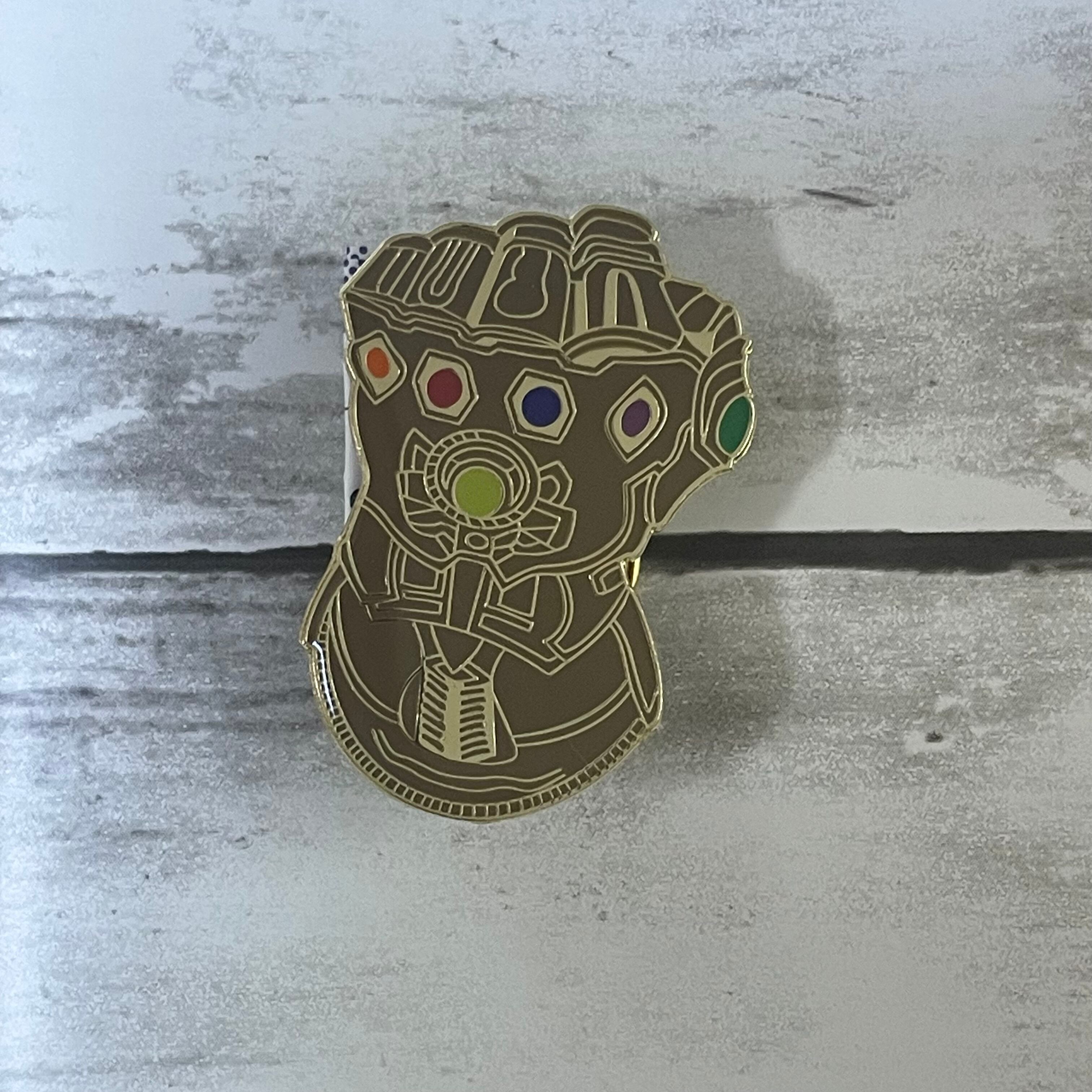 マーベル映画アベンジャーズの『サノスのインフィニティ・ガントレット』をデザインしたお洒落なピンバッジです。